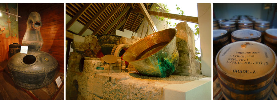 A visit to the Mt. Gay Rum factory (from left): a "pot still" is used to distill single batches of rum at a time; an original cane boiling kettle from 1700s; barrels of rum readied for blending. |