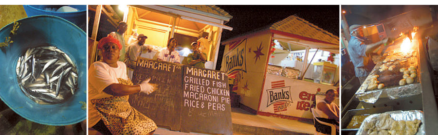 Oistin's street festival fish fry on a Thursday night From left: bucket of fresh flying fish; local street vendor and her night's specials; grilling fish and potatoes |