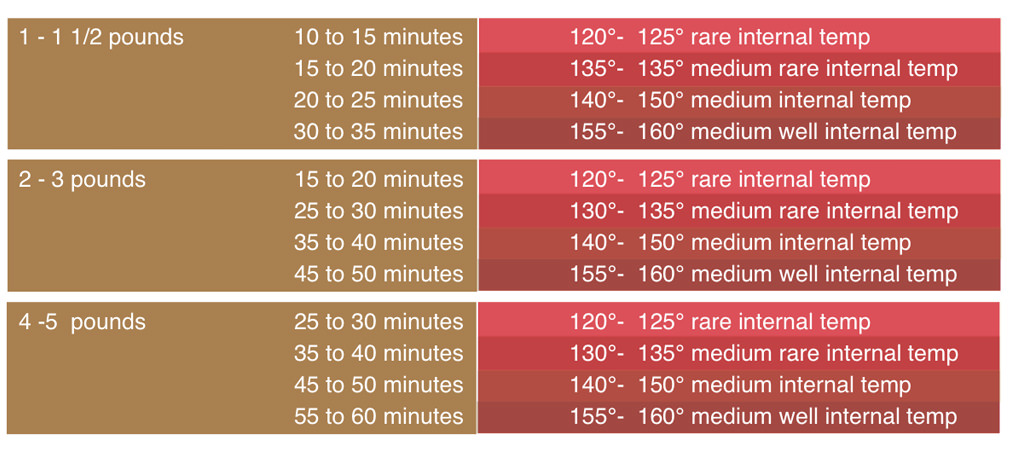 Grill the tenderloin until the outside is just seared and takes on grill marks. Place meat in an oiled roasting pan and roast on 425° until cooked to your liking. Use the chart below for approximate cooking times. We suggest using a meat thermometer for more complete accuracy. | |||||||