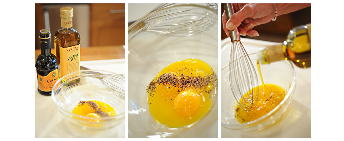 This salad is so simple to make, and so very entertaining. There are just a few basic ingredients to make the dressing, and it is the quality of the ingredients that makes all the difference. Start with four farm fresh, organic brown eggs. Separate the eggs and place the yolks into a bowl. Removing the chalazae from the yolk with tweezers or your fingers. Allow egg yolks to come to room temperature. Add a pinch of salt, a pinch of sugar and a generous grind of fresh pepper. Whisk egg yolks until smooth. | |||||||