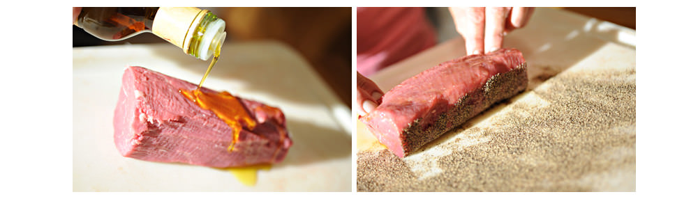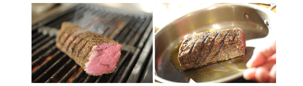 Now that you have your center cut of the tenderloin in plain sight, cut it to the appropriate length for grilling and roasting. In this case we are serving two, three ounce portions to each guest. That's about 3/4" per slice after cooking. Next, take the tenderloin, generously coat in olive oil and roll in freshly cracked black pepper. Shake off the excess pepper, wrap in plastic and let stand at room temperature. | |||||||