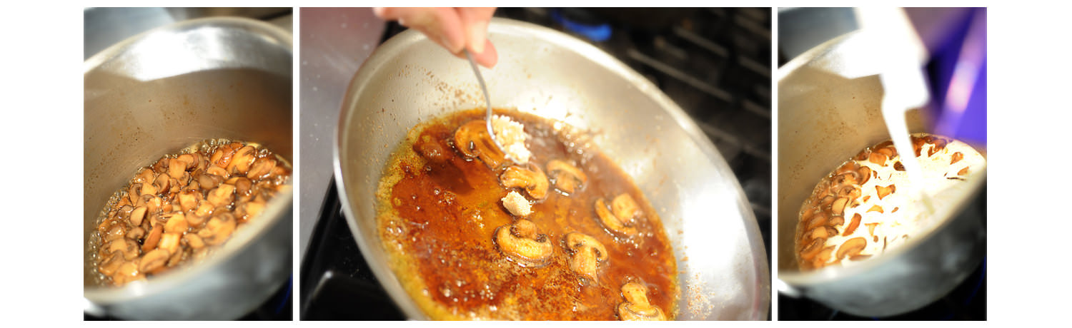 Sauté the remaining mushrooms in butter. We used Kerrygold salted. Just as the mushrooms begin to brown, add a splash of Lea & Perrins Worcestershire, swirl the pan a few times, then add a pinch of light brown sugar. Return to heat and stir continously with a wooden spoon until the mushrooms begin to crisp. Remove from heat. Cover to keep warm.