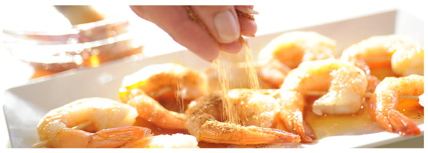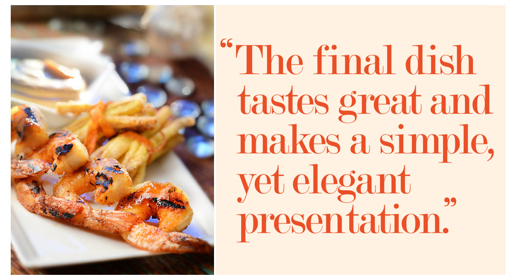 ![]() Let's start with a toast of Raspberry Royales, crafted with Zonin Prosecco and Absolut Raspberri. Topped off with a few fresh berries, this crisp cocktail makes any night worth celebrating! We like Zonin for its light, clean taste, and Absolut Raspberri for its fresh berry flavor, with no added colors. The recipe is simple - start with three parts chilled prosecco, add one part Absolut Raspberri, and top each glass with a few fresh berries. This will set the mood as you move onto the grilled shrimp appetizer. Our citrus glazed grilled shrimp appetizer is a sure hit. You'll need four to six shrimp per guest. We used jumbo Florida Gulf pink shrimp. Lightly steam and chill the shrimp prior to prepping and grilling. This ensures a fully cooked shrimp without having a tough, over-cooked exterior. It also dramatically reduces shrinkage. While the shrimp are cooling down we'll began preparing the zucchini frites. | |||||||