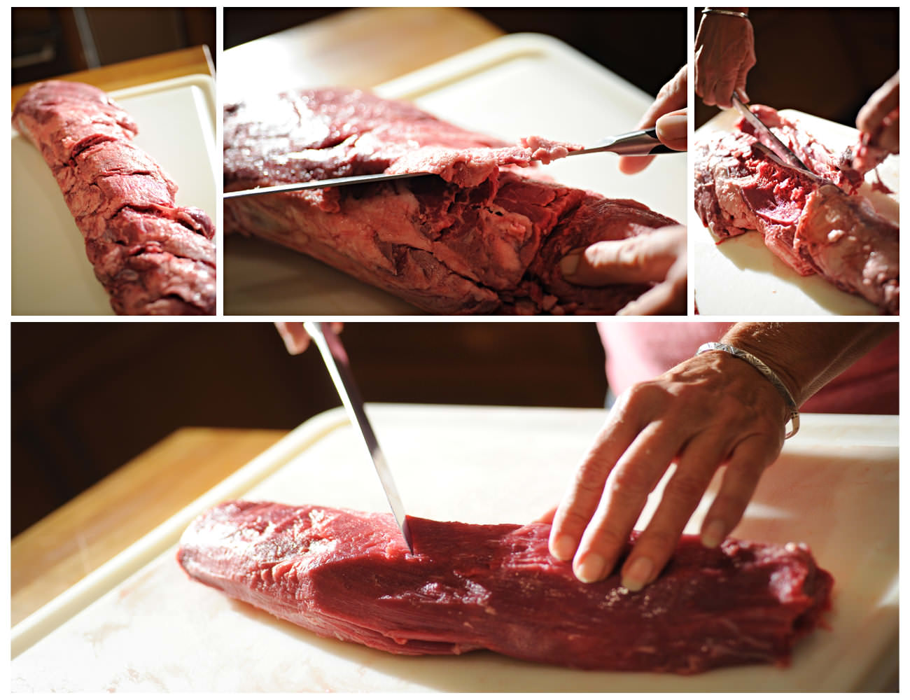 Begin by cutting away the tough exterior on the outside of the tenderloin. Once that is completed, find the natural separation of the outer and inner sections by sliding your fingers in between the outer flap and the center. The meat will naturally separate. With the aid of a very sharp knife and a few slices here and there, you'll get to the center piece in a matter of five minutes. | |||||||