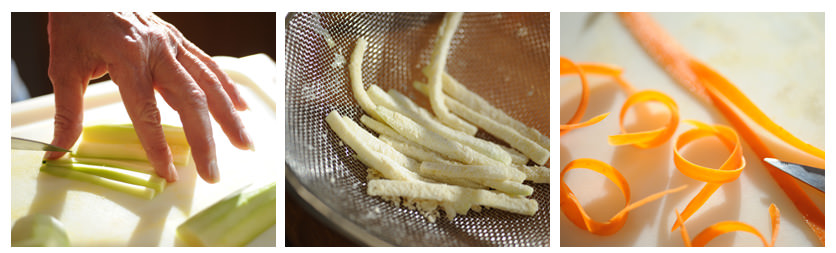 Dip the zucchini strips into the egg wash, shake off the excess until just a thin coating is left. Drop the strips into the cornmeal mixture. Thoroughly coat. Place strips into a mesh strainer and shake off the excess cornmeal coating. Tie small bundles (about 1" in diameter) of the zucchini strips with the carrot slices. Once you have enough bundles tied, drop them into the fryer (six bundles at a time) and fry until a light tan color (about 1 - 2 minutes). Set aside on a paper towel lined tray and place in a warming oven. Serve within three minutes of cooking. Make sure you coordinate when you'll be frying the zucchini. You can always fully prep ahead of time (about an hour) and set aside so the frying can take place right after the shrimp are grilled. | |||||||