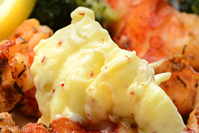 The ingredients are simple: a good (preferrably European, New Zealand or Irish) unsalted butter, a pinch of light brown sugar, and a helping of saffron...real saffron. Here's how you do it: Finley chop the saffron threads. Soften butter to room temperature. Take several tablespoons of the softened butter and heat on low just prior to clarifying, add the saffron, remove from heat and let cool to room temperature. Blend this mixture thoroughly into the remaining softened butter, and whisk in 3/4 teaspoon of light brown sugar. Fold into a mound and refrigerate. About an hour before serving the tails, remove the butter from refrigeration and let warm to room temperature. The flavor is subtle, rich and smoothes out the bite from the blackened seasoning. It's a bit of "heat and sweet". |