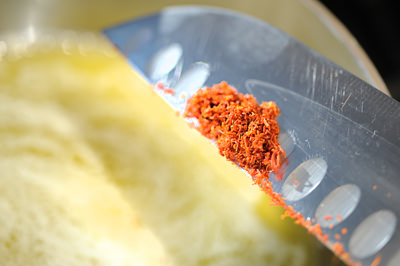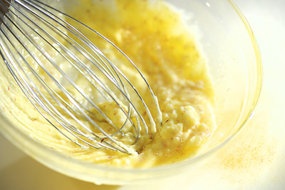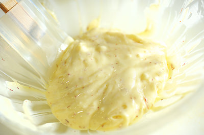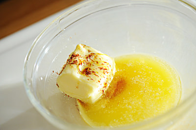 3. | Add saffron and sugar to melted butter. Whisk gently, remove from heat and let cool until just warm. |