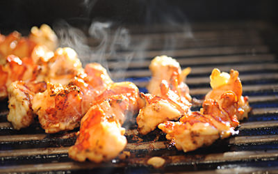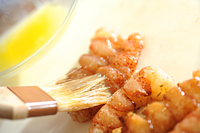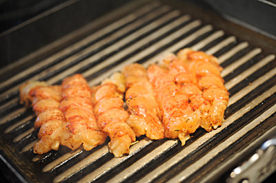 7. | Line the tails up (seasoned side down) on a metal spatula so they can be laid out on the grill pan simultaneously. |