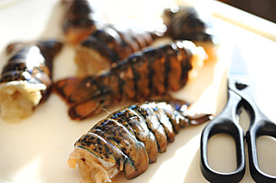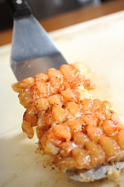 While everything else is cooking, we'll knock out the tail prep and cooking in no time. Lay your tails out on a cutting board, have your shears, blackened seasoning, and melted butter ready. Turn the grill pan and broiler on high. From the time we start this process until the time we're ready to serve will be around 15 minutes, which means the sides will be ready to serve as well. First we have to get the meat out of the tails. Here's a little "How To" primer that might help you. |