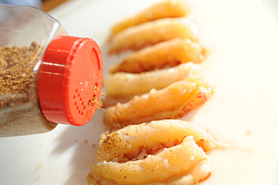 5. | Cut each tail in half lengthwise. Arrange on cutting board. Coat the cut (flat) side of the tail in blackened seasoning. |