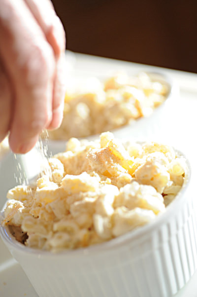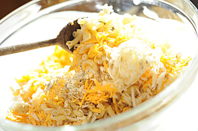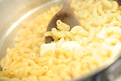2. | Boil the pasta just shy of al dente (it'll finish cooking during the baking process). Strain, toss in two tablespoons of butter, mix until melted, let cool to room temperature. |
