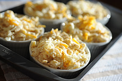 6. | Spoon mixture into individual ramekins. Moderately dust with bread crumbs. Sprinkle on remaining cheese and drizzle cream over top. |