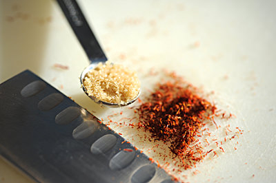 2. | Chop saffron into a very fine mince. Measure 3/4 teaspoon of light brown sugar. |